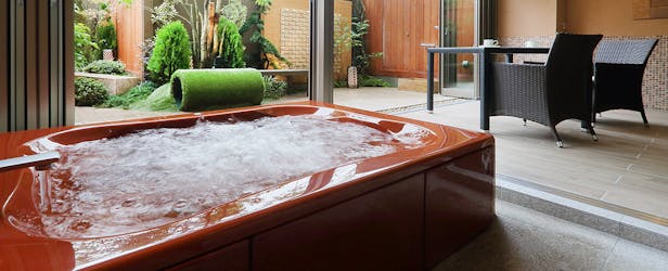 Dogサバトリーとは、お庭と室内を繋ぐ、半屋外の空間。お部屋には温泉露天エアブローバスを完備。「Dogサバトリーのある宿 ご・遊庭」はまさに贅沢な、ワンちゃん連れ温泉付き高級旅館です。